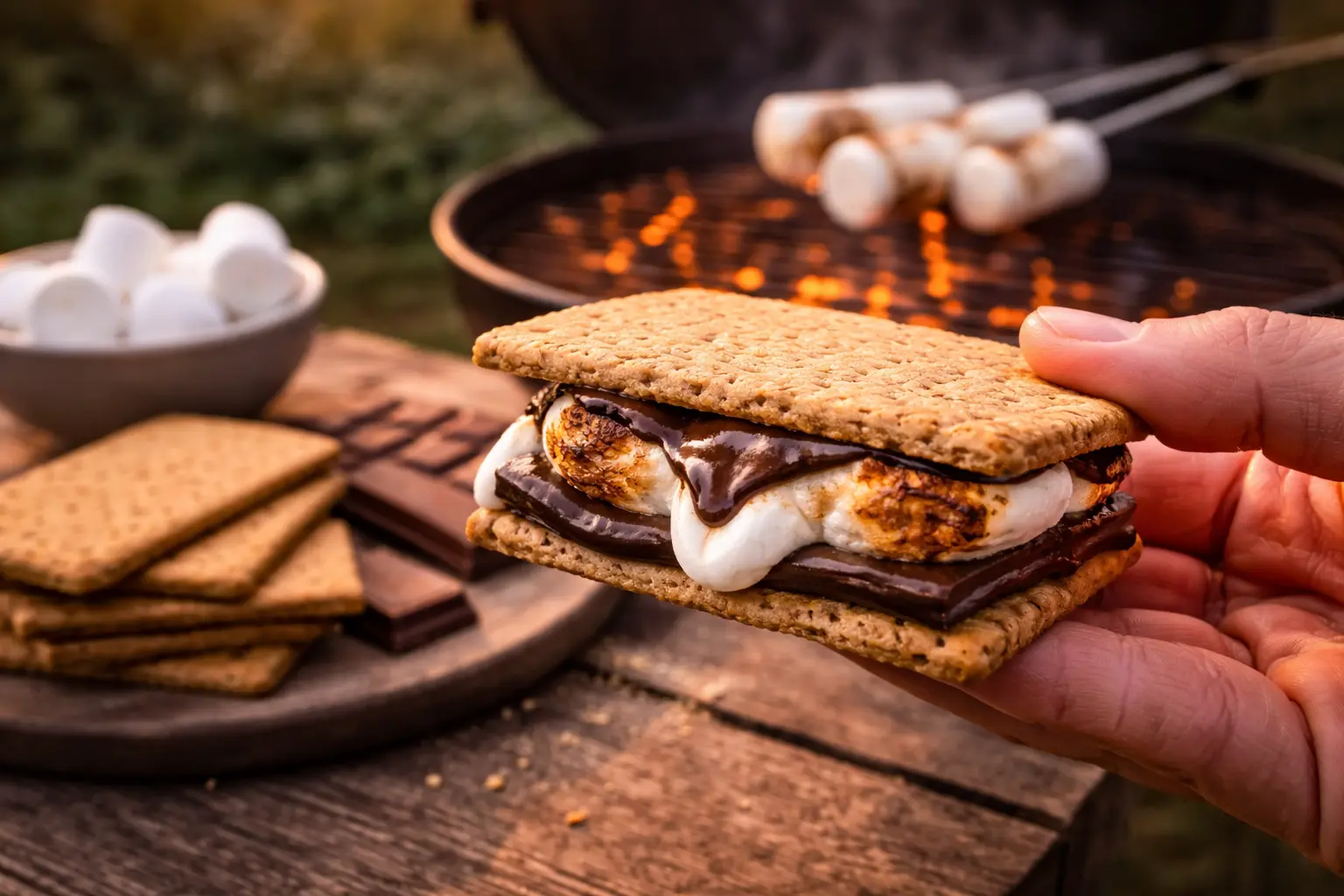 S’mores zijn een klassiek dessert dat je op de BBQ kunt bereiden. Leg een marshmallow op een stokje en rooster vervolgens deze boven de hete kolen tot hij goudbruin en plakkerig is. Plaats hierna de marshmallow tussen twee stukjes chocolade en graham crackers. Het smelten van de chocolade door de warme marshmallow is een ware smaakexplosie.